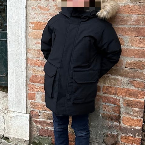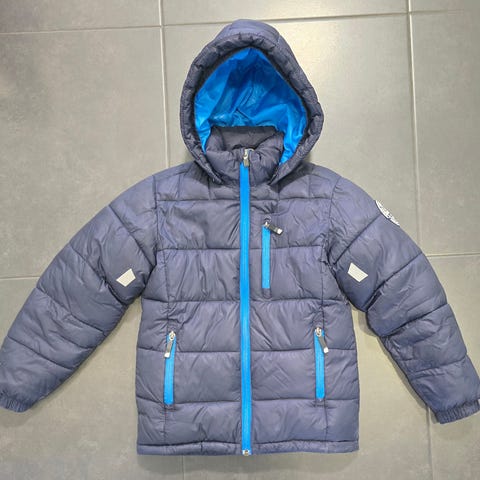 Sininen untuvatakki 70% untuvaa, 30% höyheniä. Irrotettava huppu. Untuvasisuksessa on jo jnk verran paakkuuntumista/epätasaisuutta. Yhden pienen pistekulumajäljen löysin hihan saumasta josta kuva.