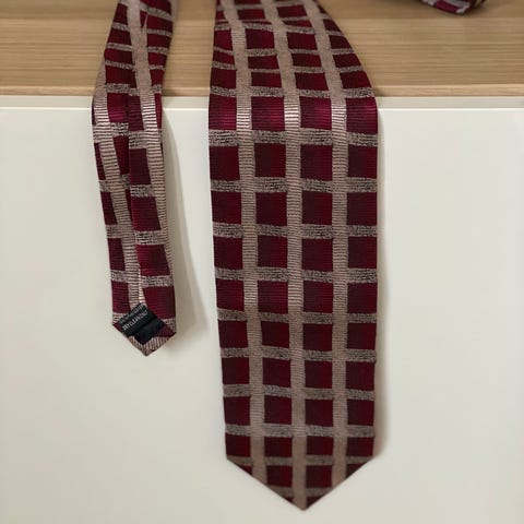 Kirjava solmio, polyesteria (?). Värit: keltainen, sininen. Hyvä kunto, kaipaa silitystä.