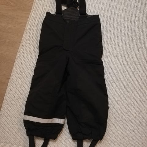 Yhdellä lapsella käytössä olleet H&M mustat toppahousut henkseleillä, vettä hylkivä pinta. Kumilenksuissa rispaantumista, muuten oikein siistit ja hyvät housut seuraavalle.