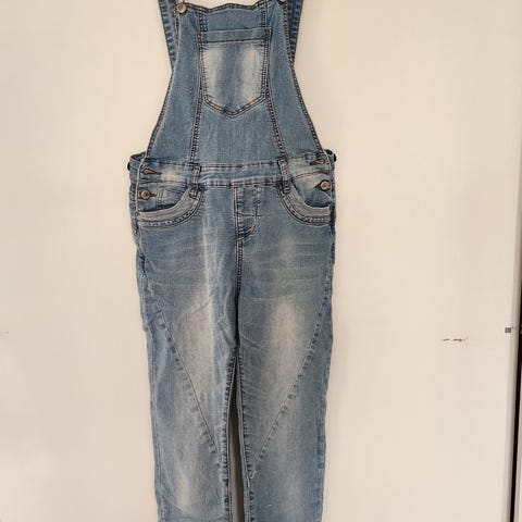 Musta / tummanharmaa haalari, farkkumaista kangasta. Koko s, mutta lahkeet suht lyhyet, haalari istuu parhaiten 155-165cm pituiselle.