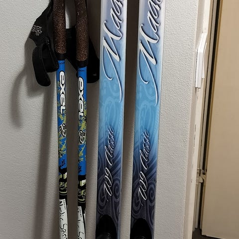 Kuvanmukainen suksipaketti Atomic sukset 148 cm ja sauvat 130 cm. NNN siteellä.