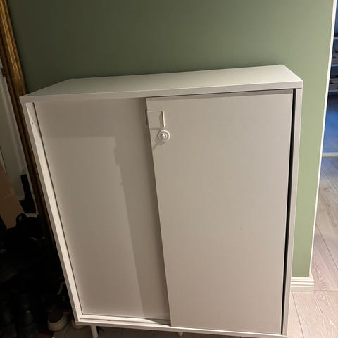 Annetaan valkoinen kenkäkaappi, jossa kaksi avattavaa hyllyä kengille, nouto Espoon Niittykummusta