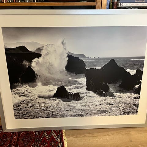 Iso IKEA taulu, jossa on sepia-sävyinen kuva laiturista järvimaisemassa. Soveltuu seinäkoristeeksi erilaisiin sisätiloihin.