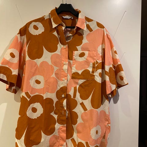 Myydään Marimekko Unikko -t-paita (Nokkela/Vaikutus -malli). Paita on hyväkuntoinen ja valmistettu pehmeästä puuvillatrikoosta. Edessä näyttävä Unikko-kukkakuosi oranssin ja vaaleanpunaisen sävyissä. Ajaton ja helppo yhdistää eri asukokonaisuuksiin. Koko M.