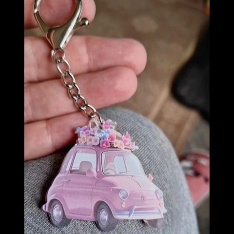 Myydään pinkki skootterin muotoinen avaimenperä.