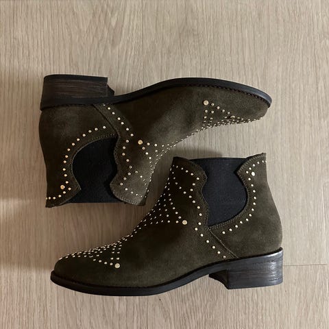 Steve Maddenin nilkkurit koossa 38. Vastaa kokoaan. Vaalean beige väri, valmistettu mokkanahasta. Saappaissa on paksu valkoinen pohja, sivuilla joustavat kuminauhat.
