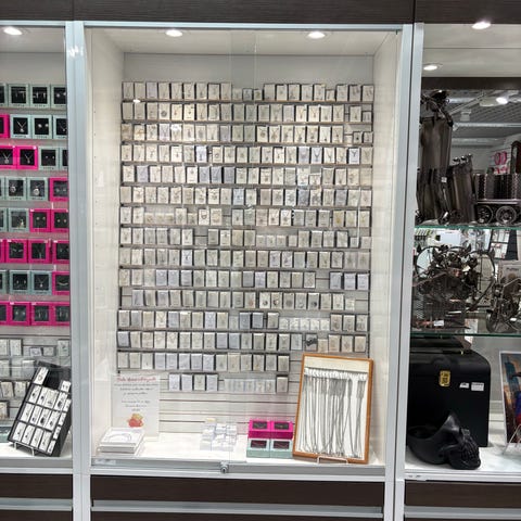 Vanha myymälävitriini. Etuosa ja sivut lasia, takaosassa vetolaatikon päädyt puuviilua, sisällä valkoiseksi maalatut puulaatikot, metallijalat. Painava. Lev 120cm, syv 55cm, kork 85cm.