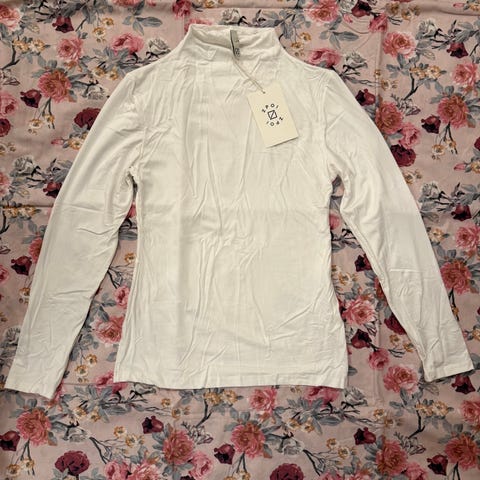 Myydään keltainen pitkähihainen paita korkealla kauluksella.
