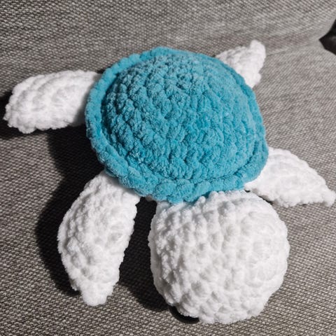 Käsityönä virkattu kilpikonna pehmolelu, jossa on keltainen ja ruskea väri. Pehmolelu on valmistettu pehmeästä langasta ja soveltuu lasten leikkeihin tai koristeeksi.