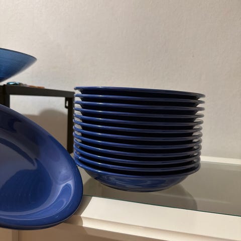 Siniset isot lautaset 2kpl siniset pienet lautaset 5kpl. Oransseja keitto ja ruokalautasia on kuvasta poiketen lisää että kumpaakin on yhteensä joko 5 tai 6 kaksi kirkasta tarjoilu lautasta.