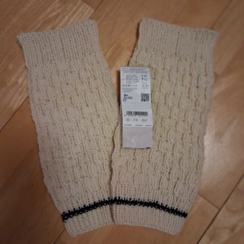 Lämpimin ajatuksin neulotut säärystimet, 40 cm, vaalea 80% villaa, vihreät raidat pehmeää mohairlankaa, 70% villaa. Hinta 18 e + postimaksu 5,50 e. Lähetän säärystimet sinulle, voit maksaa tililleni saatuasi ne.