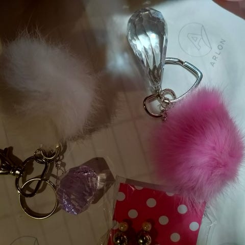 Avaimenperä, jossa iso punainen tupsu, roikkuva iso "kristalli" (muovia) sekä karabiinilukko.