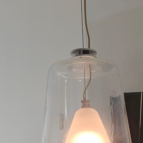 Design Marta Laudani, Marco RomanelliMitat (LxKxS) ovat kokonaisuudessaan noin 24 x 30 x 24 cmVarjostimen halkaisija on 24 cmLampun kanta on E27, max. 150 WSokeripalaMateriaali: lasi, metalliKierrätyskeskuksen tarkistama laite.