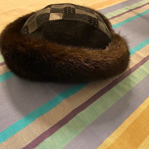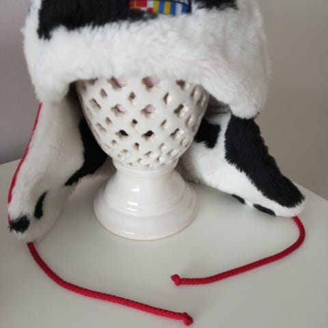Naisten talvihattu. Hatun sivuilla korvien päälle laskettavat suojat, jotka voi nostaa ylös. Kiinnittyvät neppareilla. Hatussa myös lippa. Somisteena rusetti. Tikattu vuori. Retro. Hattu 80- luvulta. Hattu on hyväkuntoinen, mutta ei uudenveroinen. Valmistettu Suomessa.