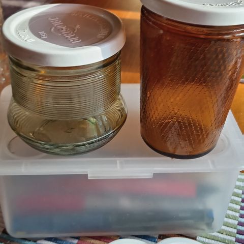 Kaksi erilaista, vanhaa sinappi- ja/tai juustolasia.
