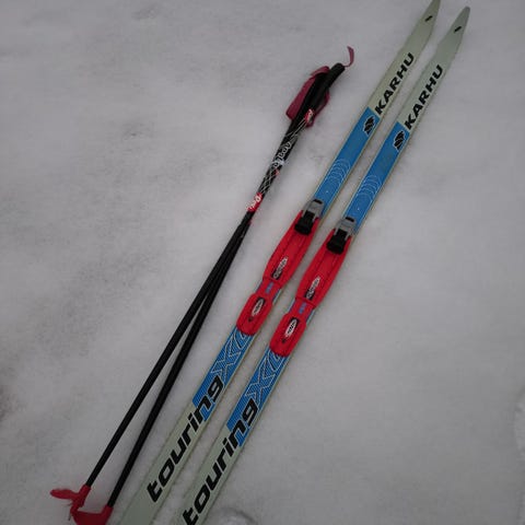 Myynnissä pakettina Järvinen sukset (130), Apollo Rex sauvat (105) ja Salomonin lämpimät monot (33). SNS side, helppokäyttöinen kiinnitys.