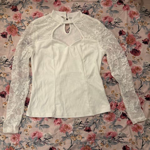 Myydään vaaleanpunainen pitsihihainen T-paita.