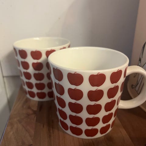 Myydään kaksi Arabian Omena mukia. Mukin on suunnitellut Heini Riitahuhta. Hinta on kahdesta mukista yhteensä 44 euroa ja mahdolliset postikulut lisätään hintaan. (Tai 22 euroa kpl)