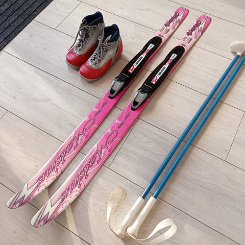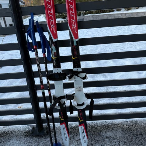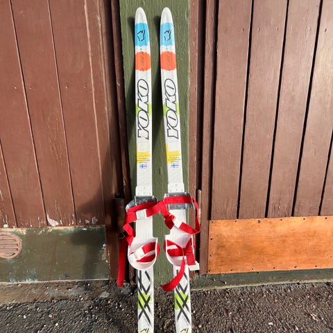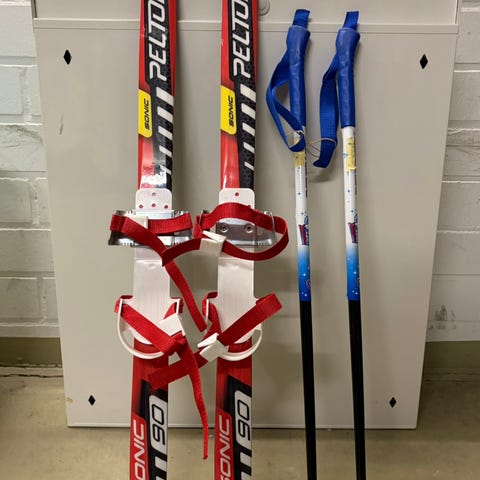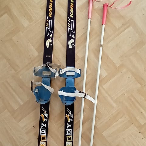 Lasten ensisukset 100 cm ja sauvat 80 cm. Sukset voiteluvapaalla pitopohjalla. Sukset kiinnitetään kenkiin.