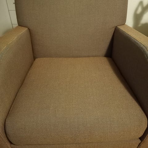 Myydään nojatuoli. Pyörii ja selkänoja kallistuu. Selkänojan yläkulmissa vähän kulumaa
