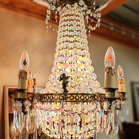 Kymmenen lampun kristallikruunu, kaikki kivet tallessa, leveys 90cm ja korkeus 80cm