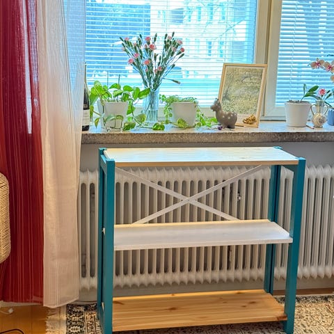 Hyväkuntoinen lundian avohylly. Päätyjen levyt voi tietty halutessaan liu-uttaa pois jolloin saa avokylkisen hyllyn.