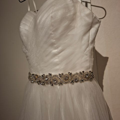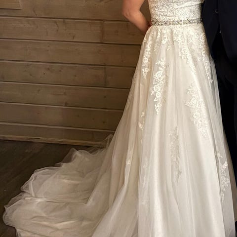 White One Barcelona häämekko. Koko on muokattavissa 38-42 kokoon saakka nyöreillä. Koristepitsi satiinin päällä vaatii vaihtamisen toiseen pitsiin/kankaaseen.