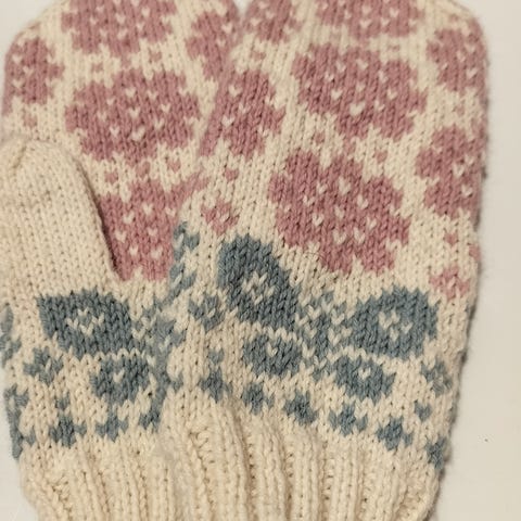Käsinkudotut aikuisten kirjoneule lapaset.
