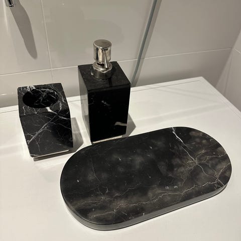 Marmorikuvioitu kylpyhuoneen setti saippua-annostelijalla ja tarjottimella