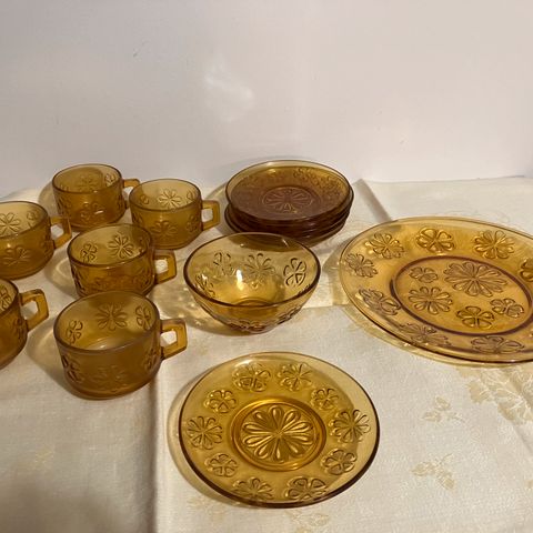 Vereco France 'Daisy' -kuvioitu lasikuppi ja tassi meripihkanvärisenä.
