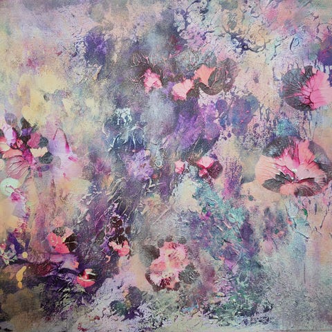 Uniikki akryylimaalaus, valmistunut n. vuonna 2015. Teoksen pinnassa tekstuuria, joka näkyy lähikuvassa.