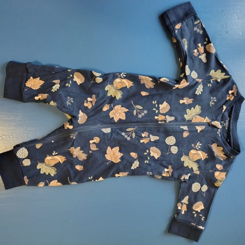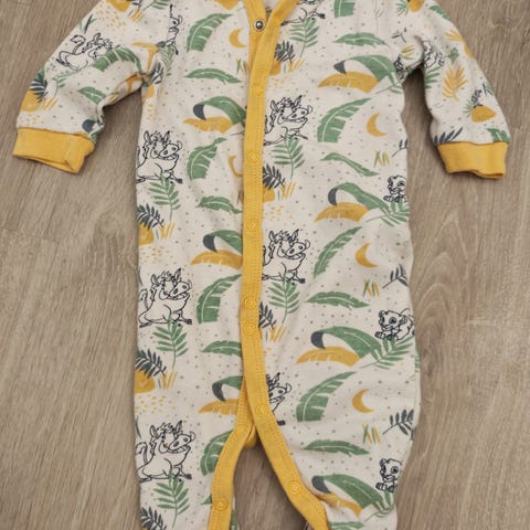 63-69cm/6 kk ikäiselle merkintä, mutta meille meni just pieneksi kun 6kk tuli täyteen, eli ehkä aavistus pienempää mittaa, 3-5 kk optimi. Uutena ostettu, ollut pari kk käytössä. Siisti kunto, printti ehjä. Takana vaipanvaihto "luukku" . Ei ole käännettäviä hihoja, "sukka osat löytyy. Kaunis vihreä väri.