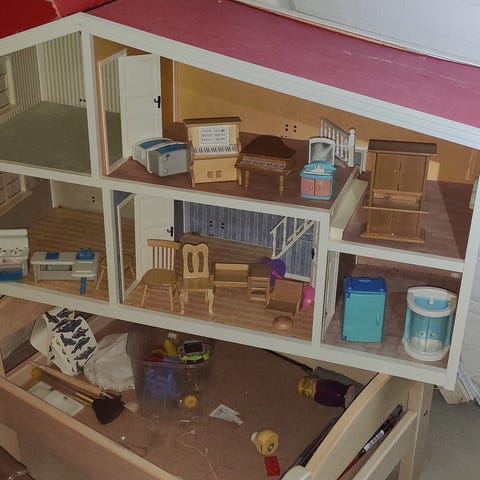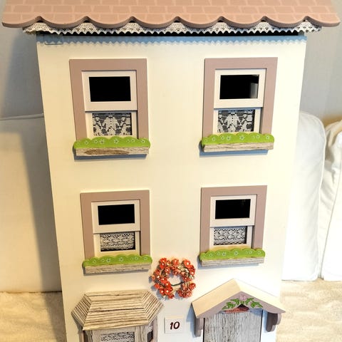 Itse koottava puinen minitalo. Kaikki siihen sisältyvän saa mukaan. Korkeus 25cm, koko 18x27cm. Olen maalannut, tehnyt lattian ja katon jäätelötikuista.