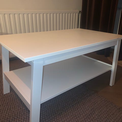 Ikeasta ostettu valkoinen tukeva sohvapöytä. Jalat harjattua metallia.
