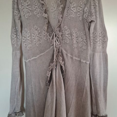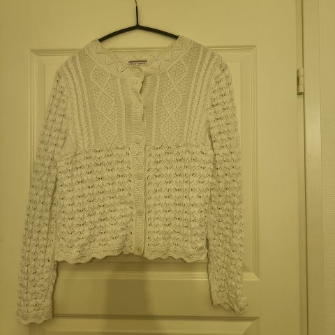 Itse kudottu neuletakki kaunista pitsi-/palmikkoneuletta kuosissa pysyvästä puuvilla-polyesterilangasta (50/50).