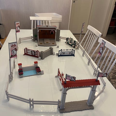 Schleich suuri esterata ja kilpailusettiareena. Sisältää mm. palkintokorokkeen, sisääntuloportin, suuren kilpailuareenan, palkintoja sekä 14 aitaelementtiä.