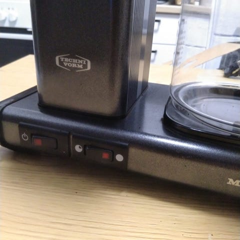 Moccamaster kahvinkeitin mustan kahvin ystävälle. Keitin on 15 v vanha ja keittää kahvin normaalia haaleampana.