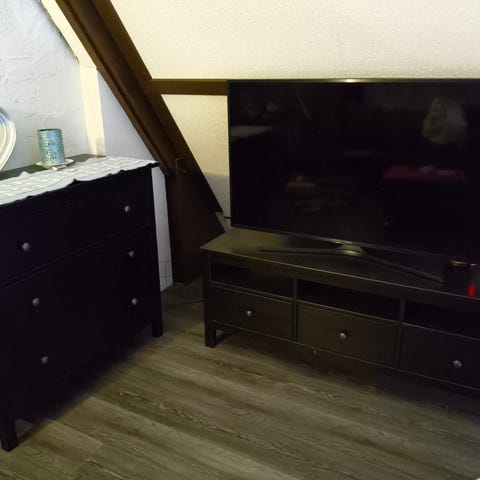 Tukeva tv-taso. Kuvissa näkyy kunto. Naarmuja pinnassa ja hyllyssä kuvassa näkyvää värittymää. Maalaamalla saa kuin uudeksi.