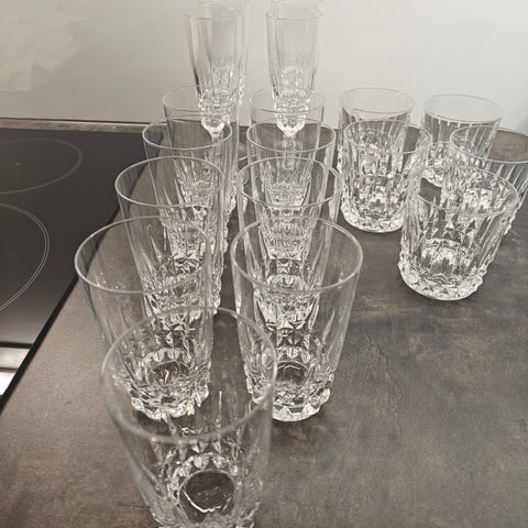 3kpl punaviini, 5kpl valkoviini, 2 kpl iso grogilasi, 2 kpl konjakki ym.