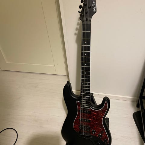 Harley Benton Telecaster sähkökitarat musta, varustettu vaalealla kaulalla ja mustalla kitaran rungolla. Mukana kitarakaapeli, plektrat ja teline akustiselle kitaralle ja kitarapussi nuottitaskulla.