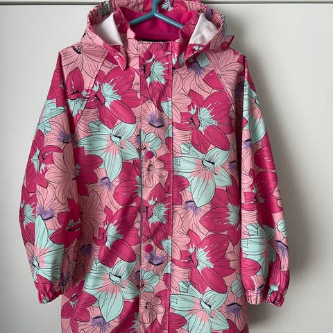 Hyväkuntoinen, sydänkuvioinen sadetakki, koko 110.