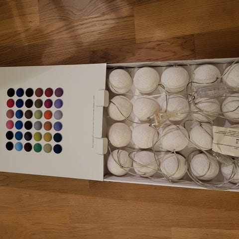 N 6cm halkaisijaltaan olevia palloja ketjussa. Kaksi ketjua myynnissä. Verkkokangaspallot valkoisia, harmaita ja mustia. Kolmella patterilla toimii.