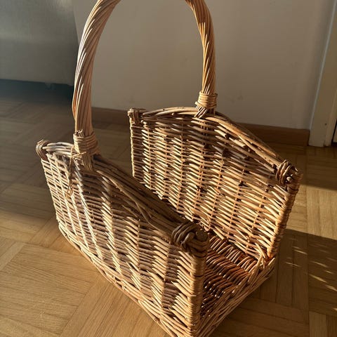 Punottu kori, jossa kantokahva. Kori on valmistettu luonnonmateriaalista ja soveltuu esimerkiksi tavaroiden kantamiseen ja säilytykseen.