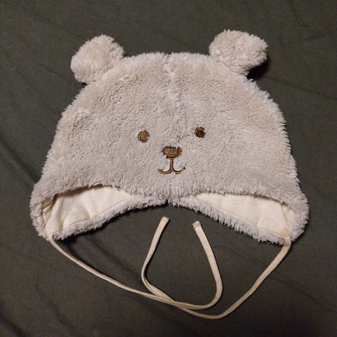 Super söpö nalle pipo teddy materiaalia. Oli ihan suosikki, kunnes jäi pieneksi. Kokomerkintää ei ole, mutta 40/44 kokoisena sopinut. Meidän vauvan päähän sopi paremmin niin, että tuo logo puoli oli eteenpäin, mutta pystyy käyttämään miten päin tahtoo.