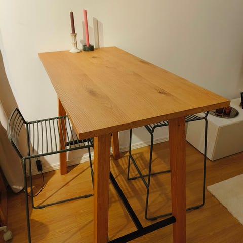 Pöytä, jossa tammen värinen puinen pöytälevy ja mustat metalliset jalat. Sopii esimerkiksi baaripöydäksi tai korkeaksi työpöydäksi.