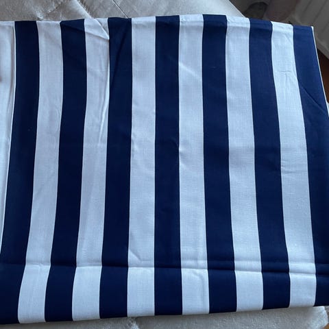 Sinivalkopilkullinen kangas. Mitat: pituus 190 cm ja leveys 150 cm.