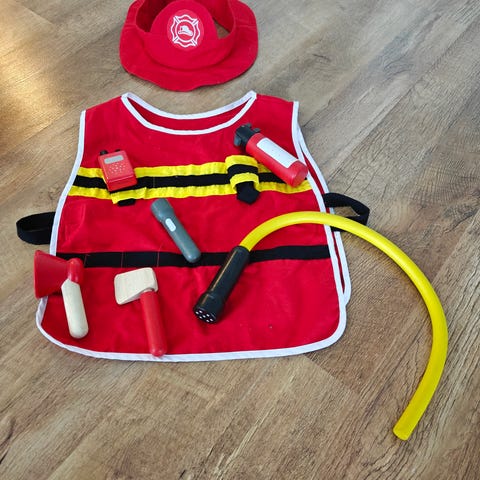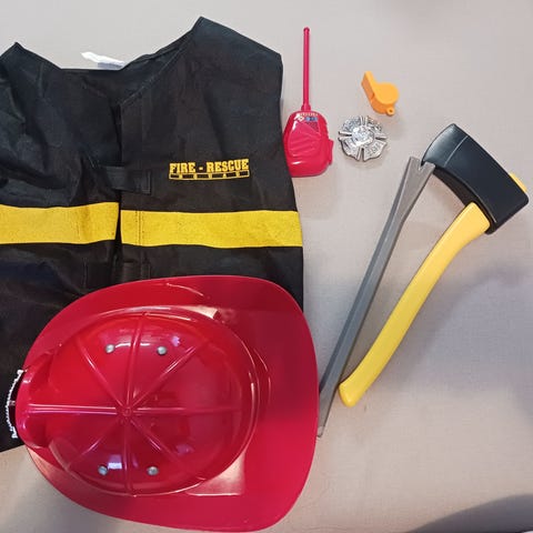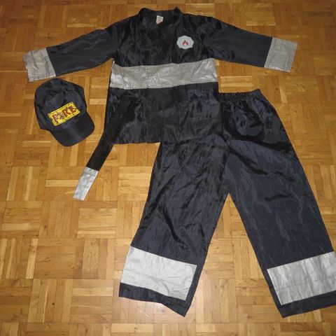 Kuvassa oleva palomiehen setti esim. naamiaisiin. Arvioisin koon olevan 3-5v. sopiva, voin tarvittaessa antaa mittoja.