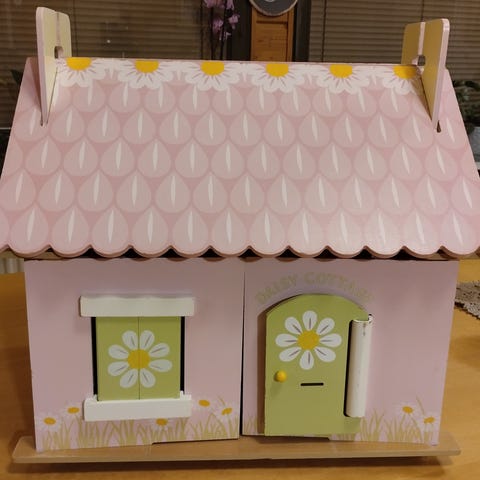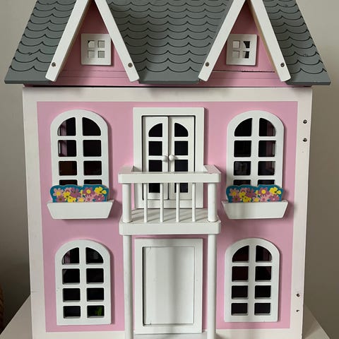 Jollyroom lasten huonekalut nukkekoti, joka on valmistettu valkoiseksi maalatusta materiaalista. Katto vaaleanpunainen. Nukkekodissa on useita avoimia hyllytiloja ja se on muotoiltu talon näköiseksi, jossa on katto ja ikkunat. Tuotteessa on käytön jälkiä, kuten maalivaurioita katon ja hyllyjen reunassa. Alimman hyllyn reunassa murtuma levyssä.