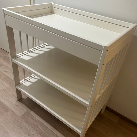 IKEA lastenhoitopöytä. Pöydässä on pehmustettu hoitoalusta ja irrotettavia säilytysastioita sekä vaipparoskis. Pöydän alahylly tarjoaa lisäsäilytystilaa esimerkiksi vaipoille ja tarvikkeille. Tavarat ei kuulu mukaan.