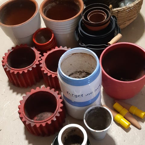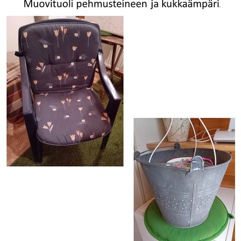 Tokmanni ämpäri, kolme muovista istutusruukkua, metallinen istutus ruukku ja kaksi savista aluslautasta. Putsaus jää hakijalle.